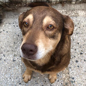 "Abandoned during the diaspora, Chocolate waited alone in an empty yard until we found him. Today, he is a healthy 'big brother' who loves sunbathing and protecting the smaller rescues."